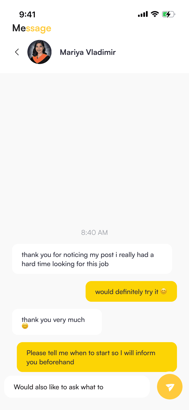 We've made our messaging feature simple to match the nature of labor jobs, which usually involve in-person interactions. To create a relaxed communication environment, we removed the "seen" feature. This approach, supported by real-time updates through Firebase, aims to ease any pressure on Taskers when receiving messages, promoting an open and stress-free communication experience.