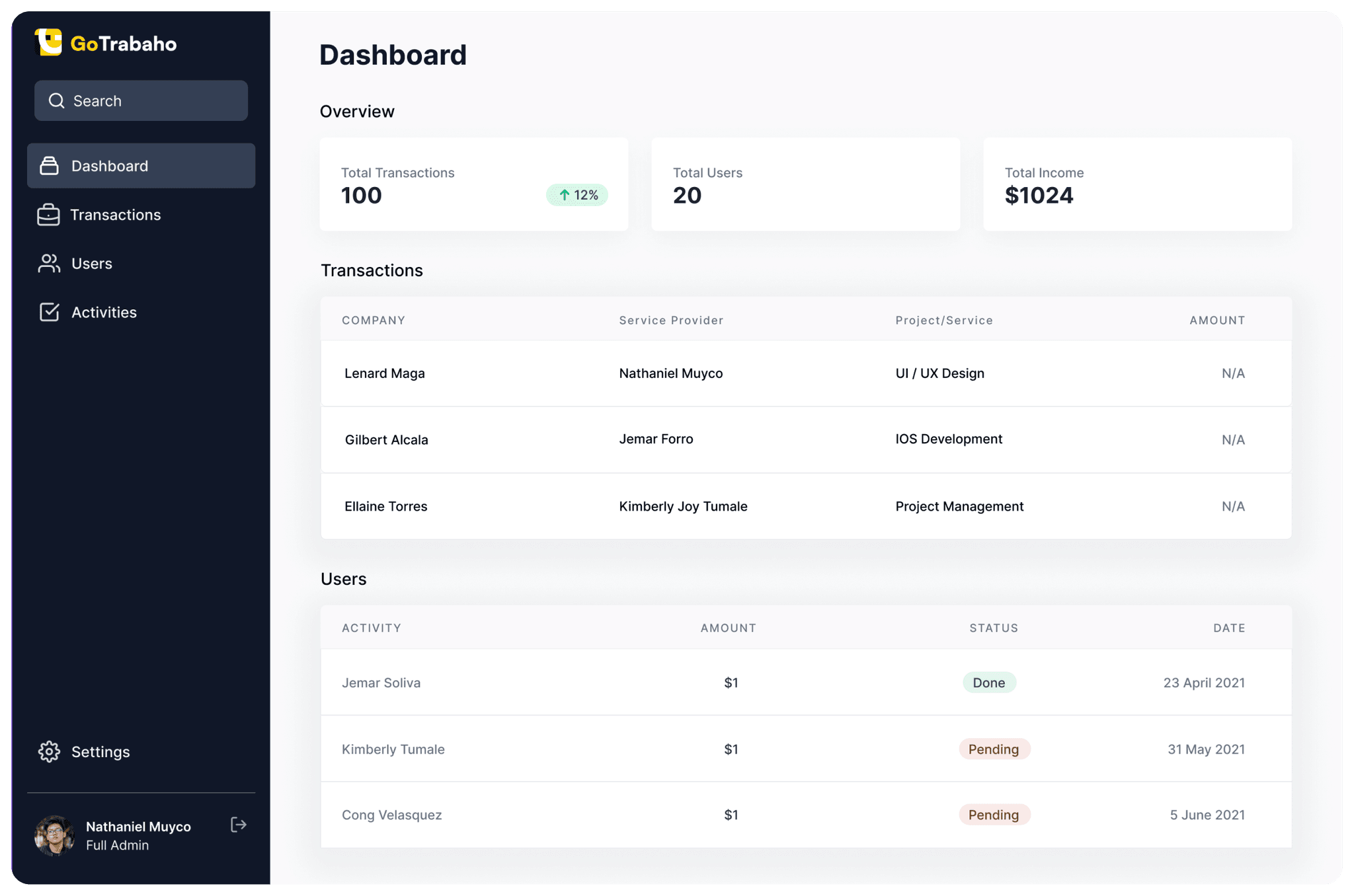 We have a dashboard that shows Transaction, Users, and Activities. In the Users section, we manually approve new users if they meet our criteria and have provided legitimate identification during onboarding. This helps ensure the security and accuracy of our user verification process.